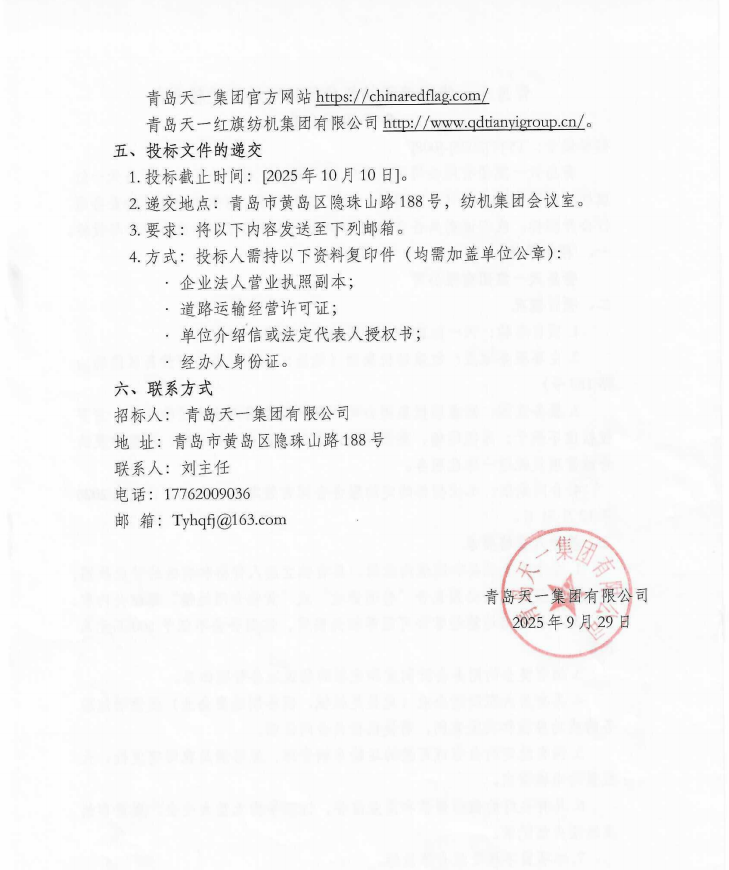 青島天一集團關于紡機集團公司物流運輸業(yè)務公開招標公告